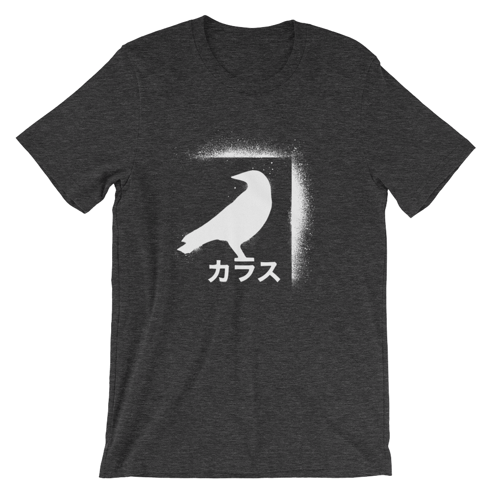 Street-Art Crow emblem with the Japanese word for "Crow" (Karasu) in Katakana characters in white on a dark grey heather t-shirt